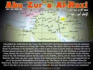 There are many great Sunni scholars who are from Rayy (i.e. Razis), all of them of course emerged in majority Sunni Persia (500 years before the Safavid Shia onslaught on most Persian Sunnis in Iran. Many where forcefully converted, killed or fled to Ottoman rules lands such as Anatolia, Iraq, Syria and even greater Khorasan and India), with the two Razis (Abu Hatim Al-Razi and Abu Zur’ah Al-Razi) being the most significant and the ones with the purest Aqidah of Ahlussunnah, they are from among the IMAMS of the Salaf.