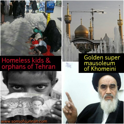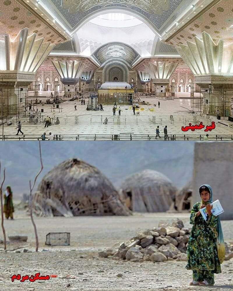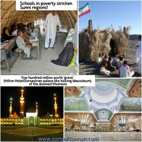Schools in many impoverished Iranian Sunni areas of Iran compared to Khomeini’s mausoleum (rather Zoroastrian Sassandid like palace), one of the largest and most expensive/wasteful mausoleums and shrines in the world.