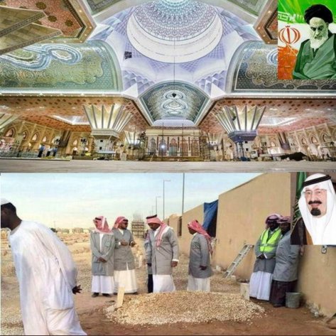 The irony: Khomeini used to repeatedly attack the lavish lifestyle of the House of Saud, yet compare the modest ISLAMIC grave of a KING (just like Sahaba & Ahlul Bayt graves in Saudi) with that of an alleged ‘modest and humble’ #Ayatollah . You don’t need to be a Saudi loyalist and fan to appreciate whose grave is Islamic and whose is not.