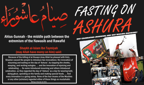 “It is reported in al-Sahih that the Prophet (peace and blessings of Allah be upon him) said: “he is not one of us who strikes his cheeks, rends his garments and prays with the prayer of Jahiliyyah.” And he said: “I have nothing to do with those who strike [their cheeks], shave [their heads] and rend [their garments].” And he said: “If the woman who wails does not repent before she dies, she will be raised up on the Day of Resurrection wearing trousers made of tar and a shirt of scabs.” In al-Musnad, it is reported from Fatimah bint al-Husayn, from her father al-Husayn, that the Prophet (peace and blessings of Allah be upon him) said: “There is no man who suffers a calamity, and when he remembers it, even if it is old, he says ‘Inna Lillahi wa inna ilayhi raaji’oon (Truly, to Allah we belong and truly, to Him we shall return),’ but Allah will give a reward equal to the reward He gave him on the day he suffered the calamity.” This is how Allah honours the Believers. If the disaster suffered by al-Husayn, and other disasters, are mentioned after all this time, we should say “Inna Lillahi wa inna ilayhi raaji’oon (Truly, to Allaah we belong and truly, to Him we shall return),” as Allah and His Messenger commanded, so as to be given the reward like that earned on the day of the disaster itself. If Allah commanded us to be patient and steadfast and to seek reward at the time of the disaster, then how about after the passing of time? The Shaytan made this attractive to those who are misled, so they took the day of ‘Ashura’ as an occasion of mourning, when they grieve and wail, recite poems of grief and tell stories filled with lies. Whatever truth there may be in these stories serves no purpose other than the renewal of their grief and sectarian feeling, and the stirring up of hatred and hostility among the Muslims, which they do by cursing those who came before them, and telling many lies, and causing much trouble in the world. The various sects of Islam have never known any group tell more lies or cause more trouble or help the kuffar against the Muslims more than this misguided and evil group (i.e. the Rafidah Shia). They are even worse than the Khawarij who went beyond the pale of Islam. They are the ones of whom the Prophet (peace and blessings of Allah be upon him) said: “They will kill the people of Islam and will leave alone the people who worship idols.” This group cooperated with the Jews, Christians and polytheists (mushrikoon) against the members of the Prophet’s household and his believing Ummah, and also helped the mushrik Turks and Tatars to do what they did in Baghdad and elsewhere to the descendants of the Prophet (peace and blessings of Allah be upon him), i.e., the ‘Abbasid rulers and others, and the believers; the Turks and Tatars killed them, enslaved their women and destroyed their homes. The evil and harm that they do to the Muslims cannot be enumerated by any man, no matter how eloquent he is. Some others – either Naasibis who oppose and have enmity towards al-Husayn and his family or ignorant people who try to fight evil with evil, corruption with corruption, lies with lies and bid’ah with bid’ah – opposed them by fabricating reports in favour of making the day of ‘Ashura’ a day of celebration, by wearing kohl and henna, spending money on one’s children, cooking special dishes and other things that are done on Eids and special occasions. These people took the day of ‘Ashura’ as a festival like Eid, whereas the others took it as a day of mourning. Both are wrong, and both go against the Sunnah, even though the other group (the Rafidis) are worse in intention and more ignorant and more plainly wrong… But Allah commands us to be just and to treat others well. The Prophet (peace and blessings of Allah be upon him) said: “Those of you who live after my death will see many disputes. I urge you to adhere to my Sunnah and the Sunnah of my rightly-guided successors (al-khulafa’ al-Rashidoon) who come after me. Hold onto it as if biting it with your eyeteeth. Beware of newly-innovated matters, for every innovation is a going astray.” Neither the Prophet (peace and blessings of Allah be upon him) nor his rightly-guided successors (the khulafa’ al-Rashidoon) did any of these things on the day of ‘Ashura’, they neither made it a day of mourning nor a day of celebration.”