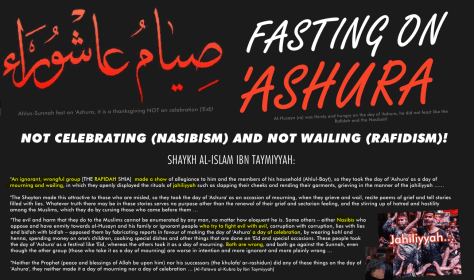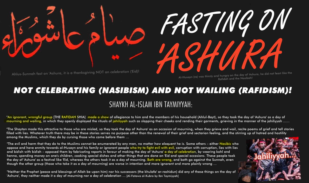 Then Ibn Taymiyyah discussed the two misguided groups who were in Kufah, Iraq, both of whom took Ashura as a festival because of their bid’ah, the worse of them are the Rafidah who have turned the martyrdom of al-Husayn and the tragedy of Karbala into an annual carnival-like event of excessive mourning, self-flagellation, cosplay, and feast (where instead of fasting they drink and eat like the Nawasib!).