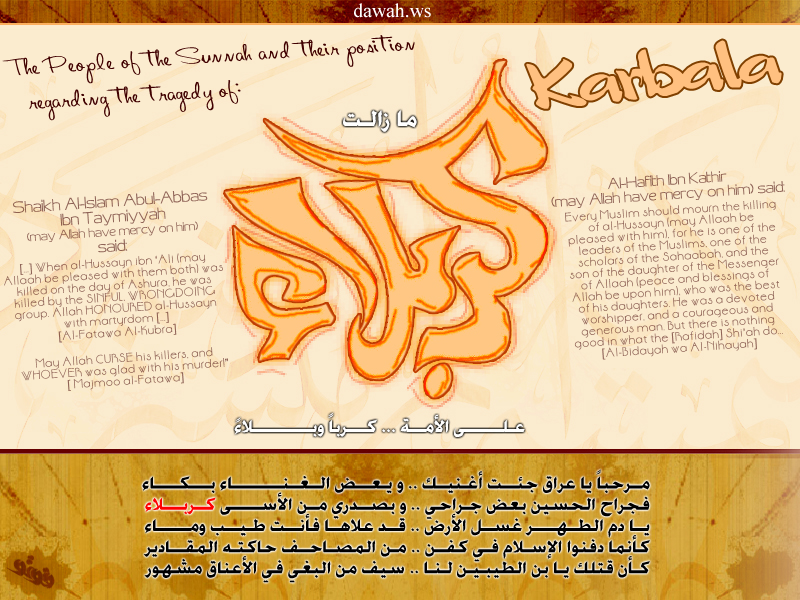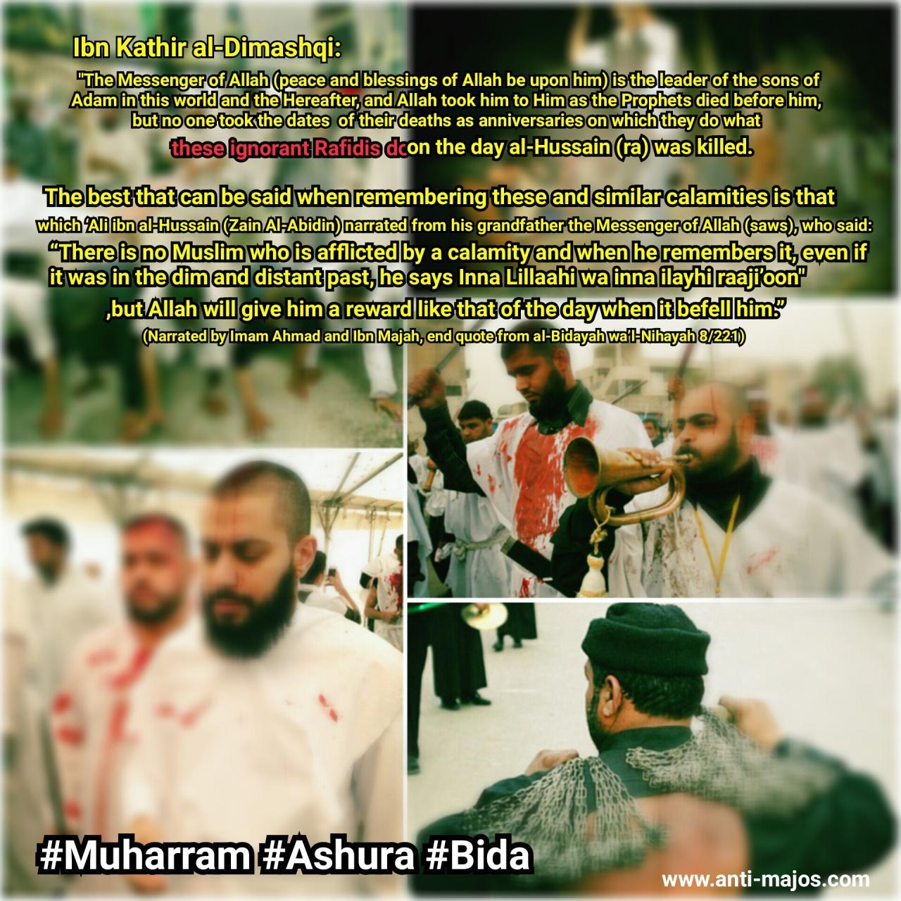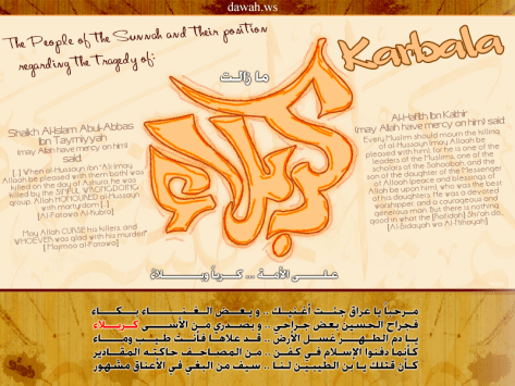 “An ignorant, wrongful group – who were either heretics and hypocrites, or misguided and misled – made a show of allegiance to him (al-Husayn) and the members of his household, so they took the day of ‘Ashura’ as a day of mourning and wailing, in which they openly displayed the rituals of Jahiliyyah(pagan pre-Islamic society of Arabia) such as slapping their cheeks and rending their garments, grieving in the manner of the Jahiliyyah. But what Allah has commanded us to do when disaster strikes – when the disaster is fresh – is to bear it with patience and fortitude, and to seek reward, and to remember that all things come from Allah and we must return to Him, as He says (interpretation of the meaning): “… but give glad tidings to al-saabiroon (the patient ones), who, when afflicted with calamity, say: ‘Truly, to Allah we belong and turly, to Him we shall return.’ They are those on whom are al-salawat (the blessings) (i.e., who are blessed and will be forgiven) from their Lord, and (they are those who) receive His Mercy, and it is they who are the guided ones.” [al-Baqarah 2:155-157] .”