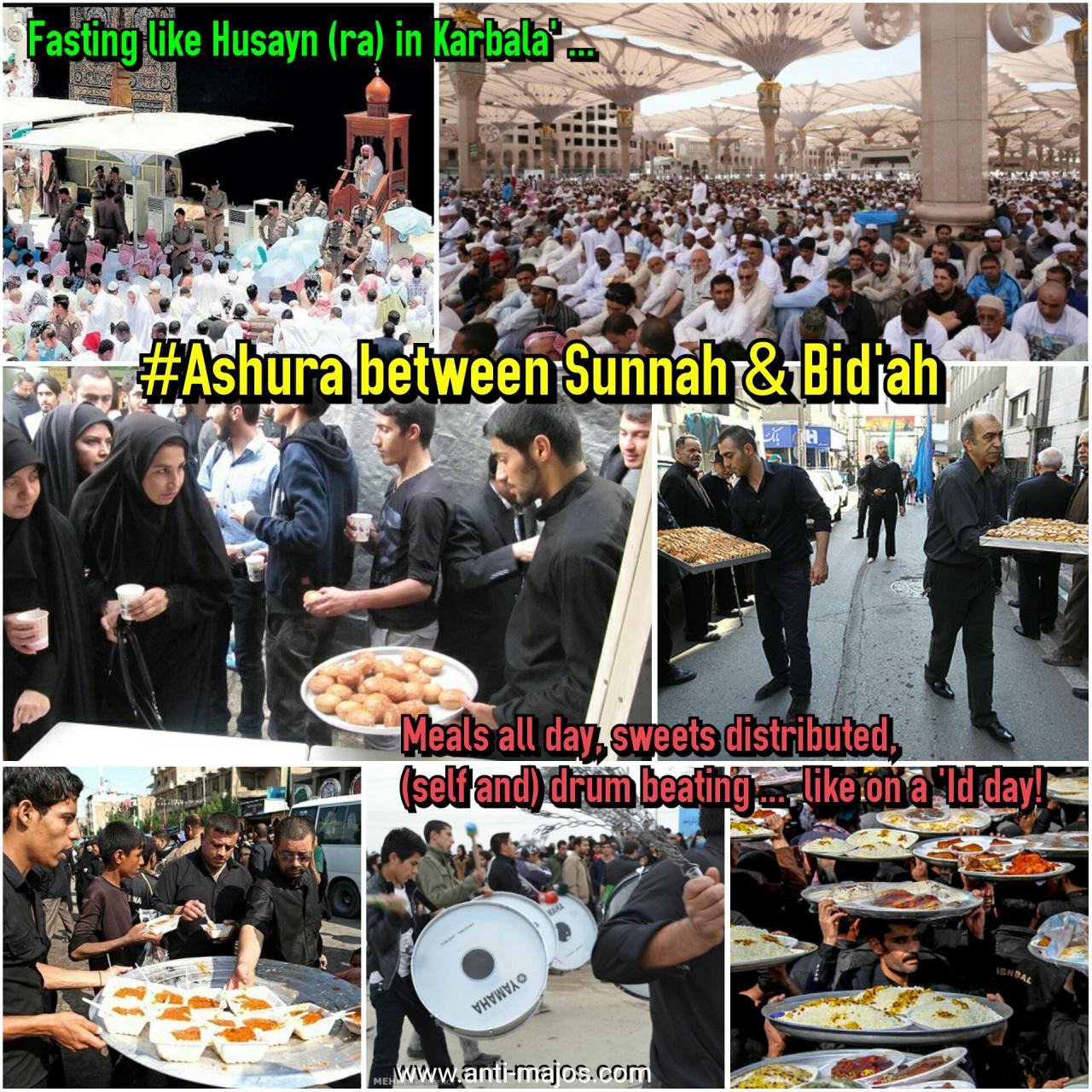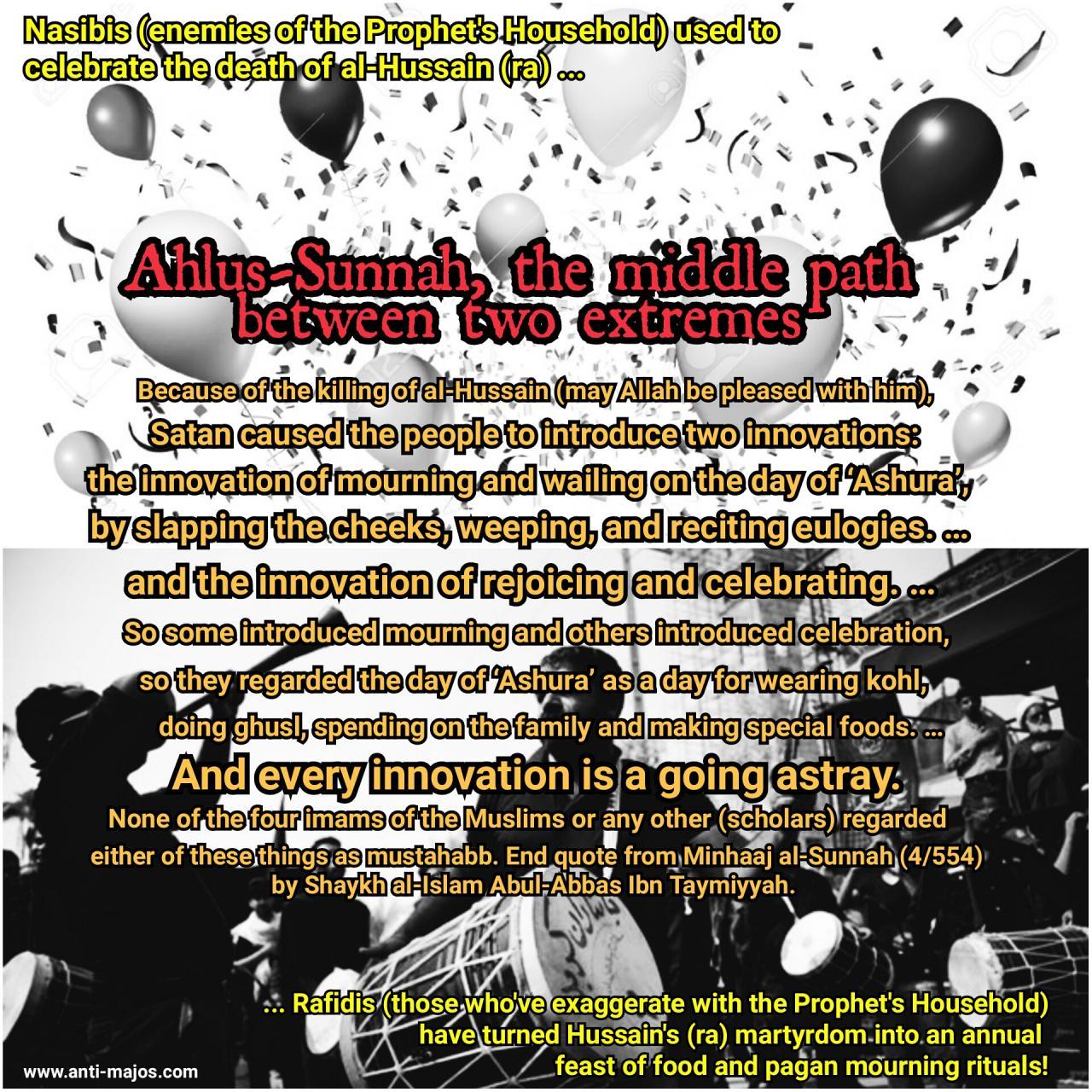 “The innovations in the religion by them are reprehensible, and what they have innovated by opposing bid’ah with bid’ah and attributing it to the Sunnah is also a reprehensible innovation in the religion. The Sunnah is what the Messenger of Allah (peace and blessing be upon him) legislated and it (the Sunnah) is free and innocent of every bid’ah. Thus, taking ‘Ashura as a day of ‘Eid is a bid’ah that was introduced by the Nawasib(enemies of ‘Ali/Ahlul-Bayt) and taking it as a day of mourning is a bid’ah worse than the aforementioned one. It is from the known bida’ of the Rawafid (Shia).”