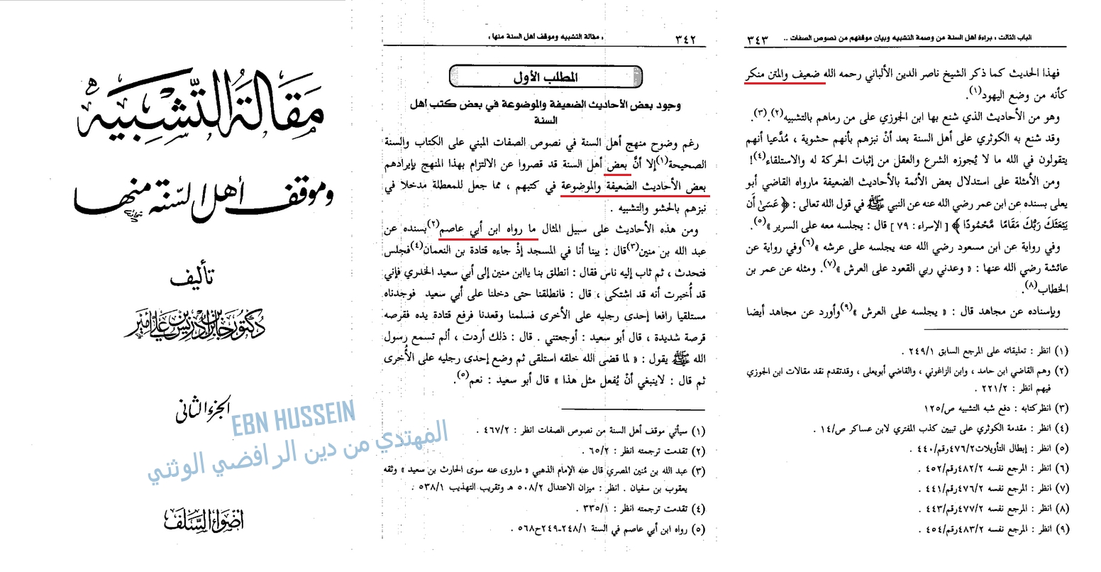 These are known books of ‘Aqidah that are agreed upon, undoubtedly kitab al-Sunnah by ibn Abi Asim is a great book, but is not a book from which we take Aqidah based on every single narration in it. So I repeat, in which of our AQIDAH books does one of our scholars say that it is from the belief of Ahlus-Sunnah that Allah sits cross-legged? Thanks for making me improve my article, I just made a quick bahth and found out how yet another Salafi scholar commented on the false narration that you try to shove down our throat in Kitab al-Sunnah.