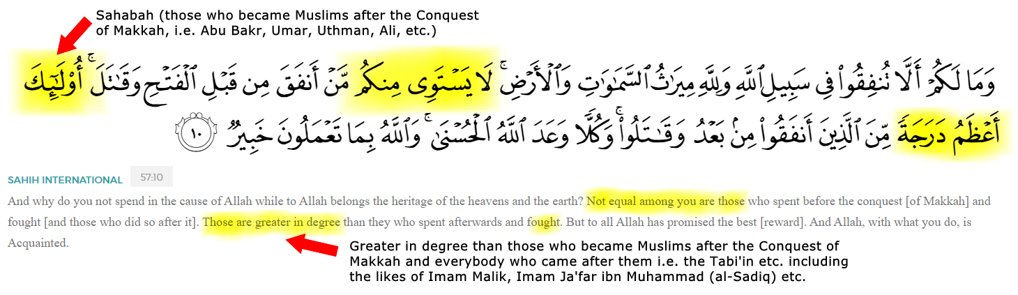 This is a clear-cut verse that proves the superiority of the Sahabah, particularly the Muhajiroon (Abu Bakr, ‘Umar, ‘Ali etc.) and Ansar (Anas ibn Malik, Zayd ibn Arqam, Abu Dardah etc.) over those who came after them. As a matter of fact, the likes of al-Baqir, al-Sadiq, al-Kadhim, al-Ridha, al-Shafi’i, Abu Hanifah etc. have been instructed to follow the chief of the Sahabah:
