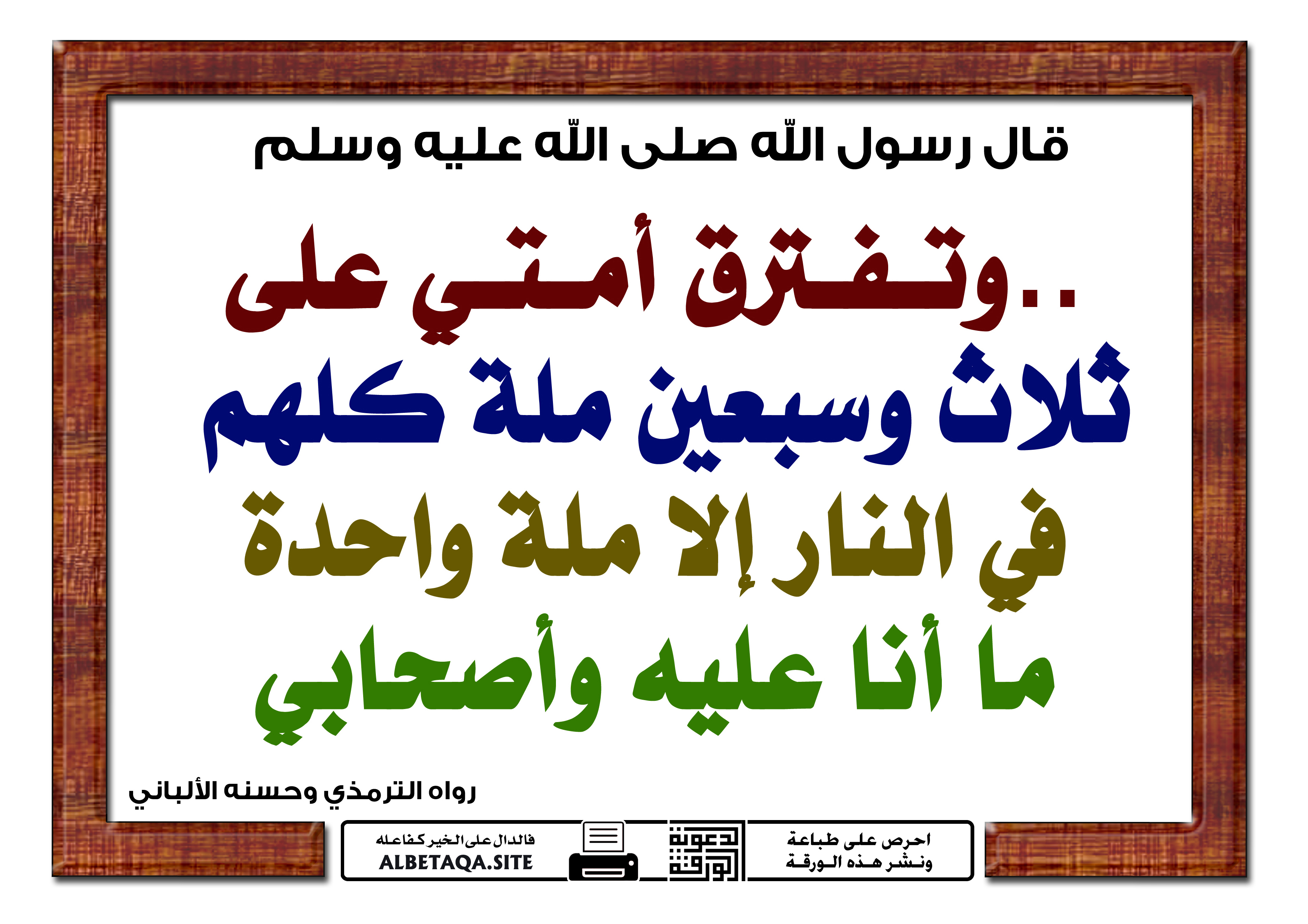 عن عبد الله بن عمرو أن رسول الله صلى الله عليه وسلم قال “ لَيَأْتِيَنَّ عَلَى أُمَّتِي مَا أَتَى عَلَى بَنِي إِسْرَائِيلَ حَذْوَ النَّعْلِ بِالنَّعْلِ حَتَّى إِنْ كَانَ مِنْهُمْ مَنْ أَتَى أُمَّهُ عَلاَنِيَةً لَكَانَ فِي أُمَّتِي مَنْ يَصْنَعُ ذَلِكَ وَإِنَّ بَنِي إِسْرَائِيلَ تَفَرَّقَتْ عَلَى ثِنْتَيْنِ وَسَبْعِينَ مِلَّةً وَتَفْتَرِقُ أُمَّتِي عَلَى ثَلاَثٍ وَسَبْعِينَ مِلَّةً كُلُّهُمْ فِي النَّارِ إِلاَّ مِلَّةً وَاحِدَةً قَالُوا وَمَنْ هِيَ يَا رَسُولَ اللَّهِ قَالَ مَا أَنَا عَلَيْهِ وَأَصْحَابِي”