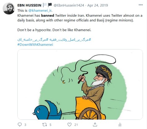 Youtube and Facebook are blocked in Iran. Twitter has been blocked since 2009 after contentious presidential elections. But that hasn’t stopped the hypocrite Khamenei and numerous Iranian MPs, Ayatullats, Basij, and other goons of the Iranian regime from owning Twitter accounts.