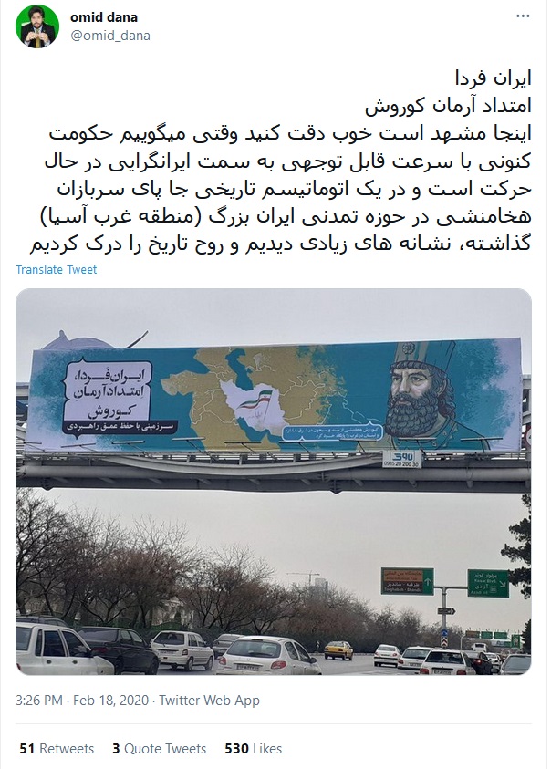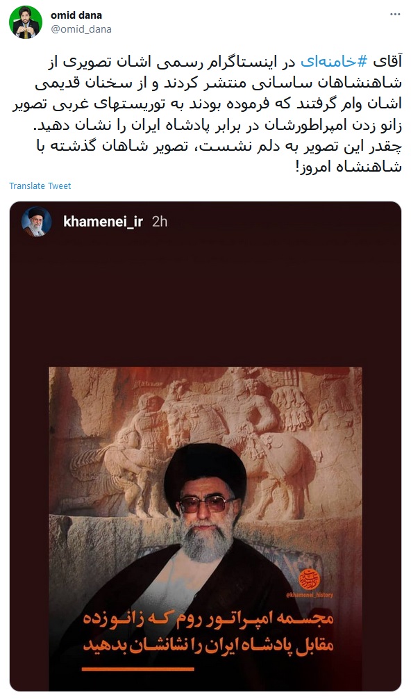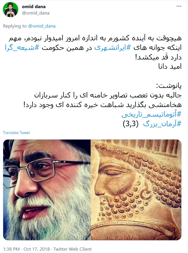 Omid Dana and people before him view Shi’ism and its clergy as a lesser evil, as an Iranian project that ultimately serves the Iranian nationalistic cause which they believe must be wholeheartedly approved, and supported for the sake of a united Iran, a greater Iran. They believe that the likes of Khamenei must be given credit for they achieved what even the Pahlavis didn’t achieve i.e. extended Iran’s borders’ (influence) to the lands of the Levant and even Yemen (a reference to the meddling of the Iranian regime in various Arab countries and Afghanistan and beyond).