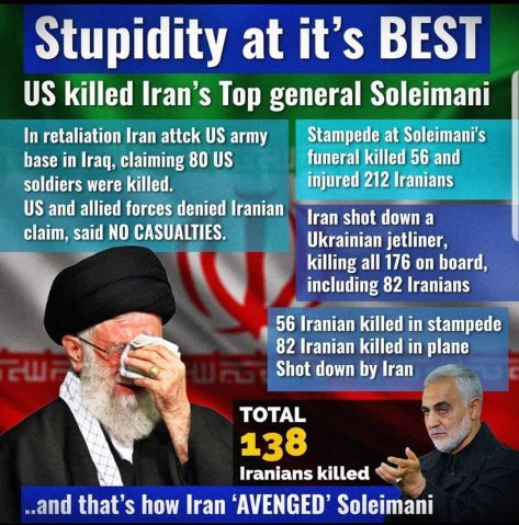 The foolish and humiliated Khomeinists have actually caused more casualties among their own than they have killed American troops. At least 40 people died after a stampede at Qassem Soleimeini’s funeral. A similar incident occured at Khomeini’s funeral, where he was stripped naked by his own followers at his funeral.