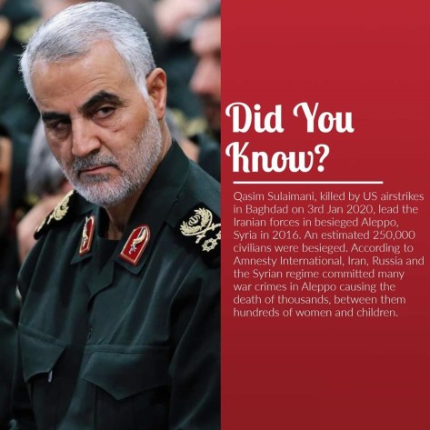 Finally, the Muslim Ummah will always rejoice at the anniliation of the enemy of Islam and the Muslims, Qassem Soleimi the aid of Bashar: