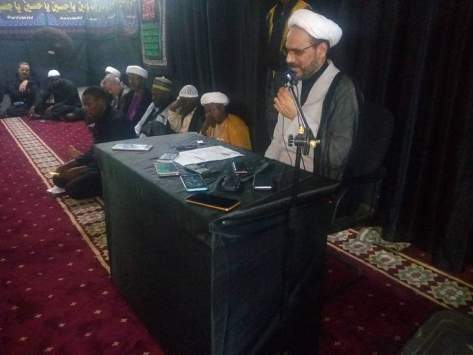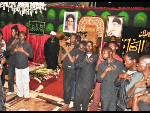 A group of West African Sufi converts to Shi’ism. The gullible have disembarked the rotten Sufi Quburi arch only to embark on an even more heretical carrier, the sinking Rafidi ship of superstitions and Kufr, and Shirk in the name of the Ahlul-Bayt. Notice how their Iranian Qommite educated leader is holding a banner of Shirk (where of course other than Allah is invoked) where his new demigod is whitewashed (just like Christian missionaries depict Jesus Christ, peace be upon him), a Persianised idol with effeminate facial features whom they know invoke for all their needs instead of invoking their previous favourite saints/Shaykhs.