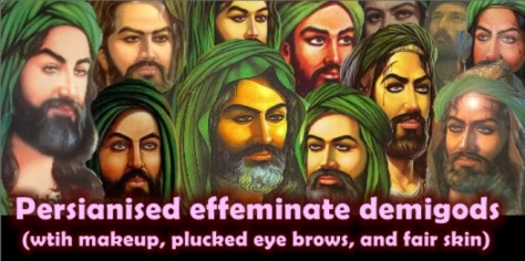 The gullible holding up idolatrous depiction of the Ahlul-Bayt depictions that are as whitewashed as the Jesus Christ that is promoted by Christian missionaries in Africa and elsewhere. A Persianised Ahlul-Bayt with a trademark of the followers of the Dajjal, the green shawl…