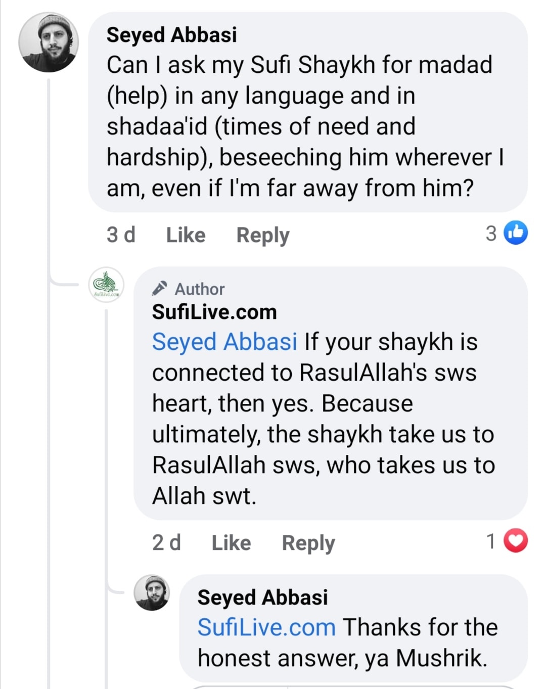 The answer I got was expected, but still, it is always shocking, just imagining that someone can claim Islam and Tawhid whilst holding the folding abhorrent pagan beliefs that resemble Catholicism more than they resemble Islam: