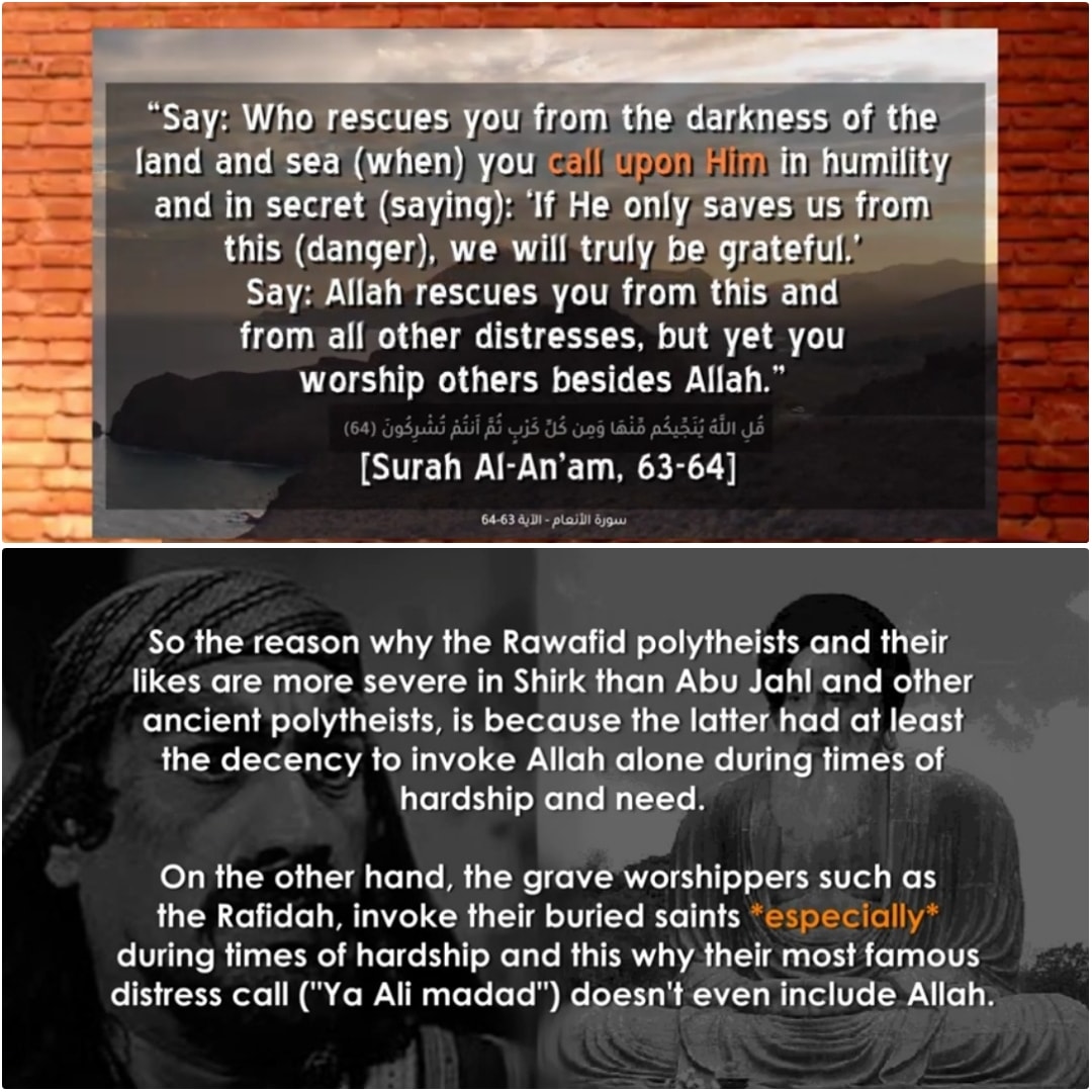 By the way: Shadaa’id (شدائد) are times of need and extreme hardship. Scholars like Shaykh Muhammad ibn Abdel-Wahhab said that the shirk of the modern-day grave worshippers (quburis) is worse than that of (some of the) polytheists mentioned in the Quran as the latter invoked (at least) none but Allah when faced with calamities.Second degree Shirk. The false deity doesn’t intercede for you directly before Allah. No, it connects you to another greater deity which then connects you to Allah.That’s why the grave worshipers can be heard saying, we are the slaves of the slaves of the slaves of Allah.Nay, ye are in fact the slaves of Satan who leads you astray!