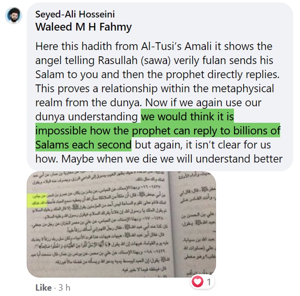 And no, the Prophet (ﷺ) being capable of hearing billions of salutations and responding to them doesn’t make him a demigod i.e. it is in no way a deification of him. It is, as mentioned, a miracle, nothing but salutations are sent to him and even those are sent by an angel. Conflating that with the mainstream Rafidi belief and practice of invoking imams for one’s need, every need, in every language, believing that the imam will literally come to one’s aid is a false analogy.
