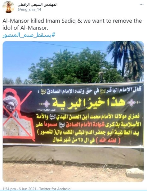 As we relive the painful memory of the martyrdom of our great Imam, Ja’far bin Muhammad al-Sadiq (peace be upon him), it would be of goodness that the first steps of purification by the removal of the statue of his killer, the Abbasid tyrant al-Dawaniqi, otherwise known as al-Mansur, may God’s damnations be upon him. [alhabib.org]