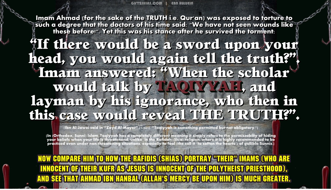 If the Imams that the Twelvers attribute to themselves were actually infallible they would have also spoken the truth or at least made Hijrah (just like the Sahabah did). Instead, according to the Shia narrative, they were busy being Taqiyyah mongering hypocrites who didn’t bother to speak the truth (and face torture).
