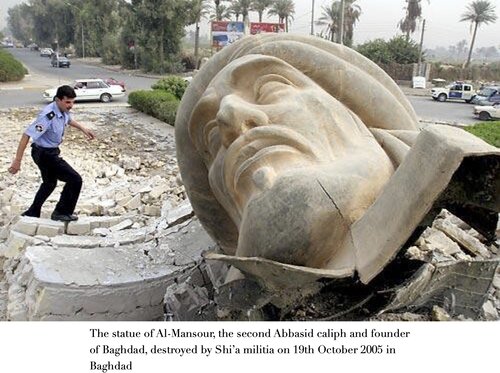 Pulling down the statue of Abu Ja’far al-Mansur or anybody else for that matter is not the issue, the issue is that it shouldn’t happen at the hands of the grave worshipping Rawafid. On the other hand, and in defense of the Sunnis: Iraq is in control of Iran and its ‘Arab’ Shia stooges. The Baathists were also fond of statues.