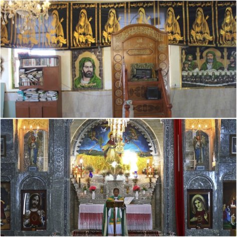 A typical Shia place of worship and self-flagellation (‘Hussainiah), covered with effeminate and Persianised (whitewashed) depictions of the Ahlul-Bayt.Imam Bukhari included an entire chapter in his Sahih which he entitled: Chapter on praying in a chapel