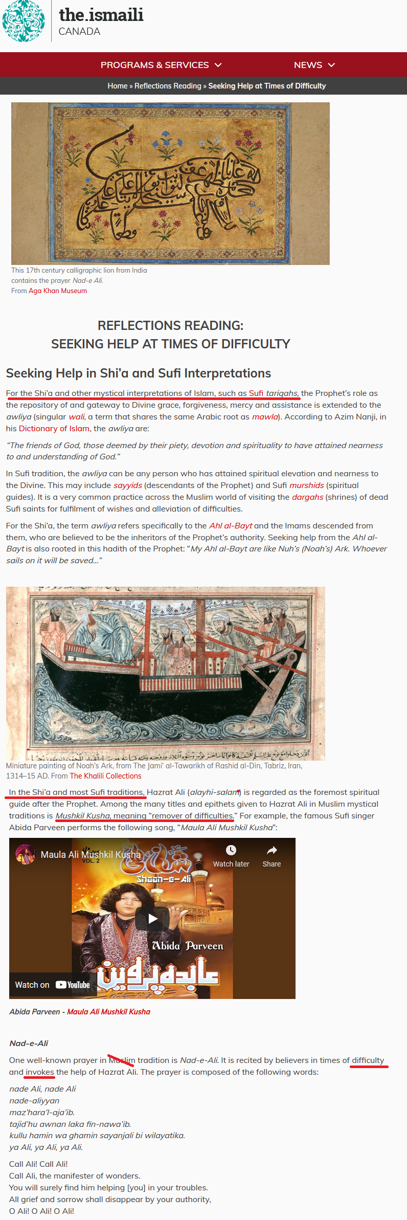 Nadi Ali (invoke Ali) is a famous (fabrication) that is chanted by Twelvers, Isma’ilis, and Sufis alike. Ismaili Rafidi mainstrea culture is no less Shirki than Twelver Rafidi culture like in Iran where instead of the muslim salamun ‘alaykum you will often hear ‘ya Ali madad‘ instead.