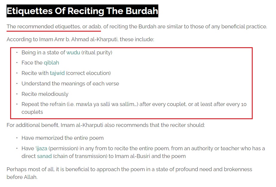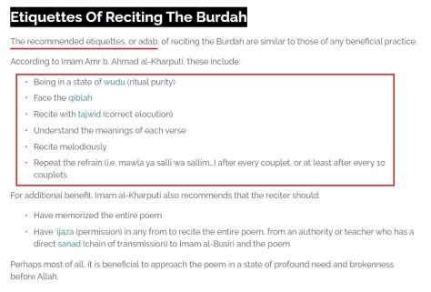 Just like the Rafidah who claim that their idle and mythical hidden imam has sanctified entire books and works of their scholars whom he met in ‘private’, the Sufis claim that their favourite poem is basically sahih according to the Prophet (ﷺ) himself. This extremism has of course lead to a fanatical defense of the poem along with accusing those who disagree with it of being haters of the Prophet (ﷺ) or at the very least not loving him as he should be loved.
