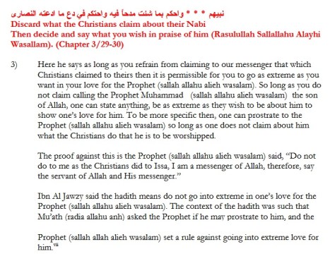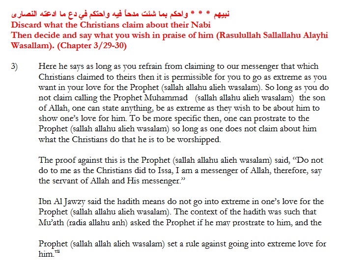 The damage control attempts by some Sufis should be regarded as a good sign, after all, it proves that even they know how problematic many segments of the Burdah is, but comparing the Burdah to Imam al-Saffarini’s longing for the Prophet (ﷺ) on Judgement Day would be an injustice against the likes of Imam al-Saffarini. This is because the Burdah is literally filled with excessive praise of the Prophet (ﷺ) to the extent where it states that one can praise the Prophet (ﷺ) with whatever praise, as long as one doesn’t claim what the Nasara claim about Jesus son of Mary (peace be upon them). This is exactly what the Rafidah say about their imams. Such beliefs upon the doors for all forms of extremism and they factually have.