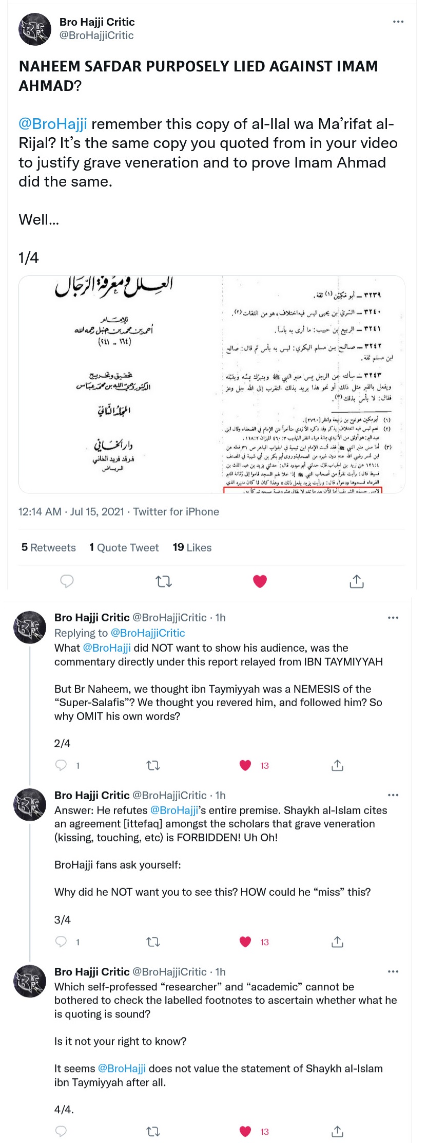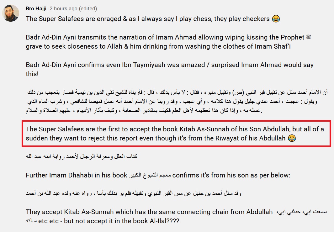 Note: 'Bro Hajji' concealed the commentary (the parts highlighted in yellow) in his video where he claimed that Ahmad ibn Hanbal was fine with grave kissing. The commentary includes delicate clarifications that 'Bro Hajji' did not want his sheepish and gullible following to see, statements by Ibn Taymiyyah, a scholar he claims to respect. The muhaqqiq of the book added comments by Ibn Taymiyyah who said that touching and kissing graves is not just a forbidden act in Islam, it is agreed upon that it is haram, no matter what grave. Furthermore, he mentions that not a single Sahabi (despite their easy access to the grave back in those times) sought blessings by touching or kissing the grave (they only did so with the pulpit as the Prophet (ﷺ) touched it, but as it got burned, it is not anymore permissible to seek tabarruk with a new pulpit). It is also mentioned that nobody (else) has attributed this statement to Imam Ahmad. The Sufi 'Bro Hajji' deceptively hid the clarification part to his viewers. One day he will have to answer for his charlatanism.