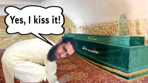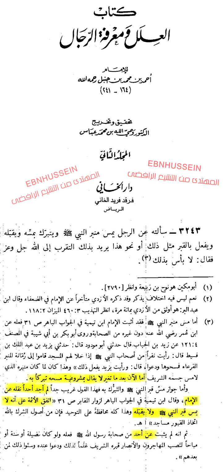The Rafidi-Sufi ‘proof’ turns out to be nothing but a spoof (as usual). The report that states that Imam Ahmad was fine with seeking blessings by touching and kissing the Prophet’s (ﷺ) is a shadh (odd) and solitary (via his son ‘Abdullah only) and on top of that it opposes other more authentic narrations in which Imam Ahmad did not condone that practice.