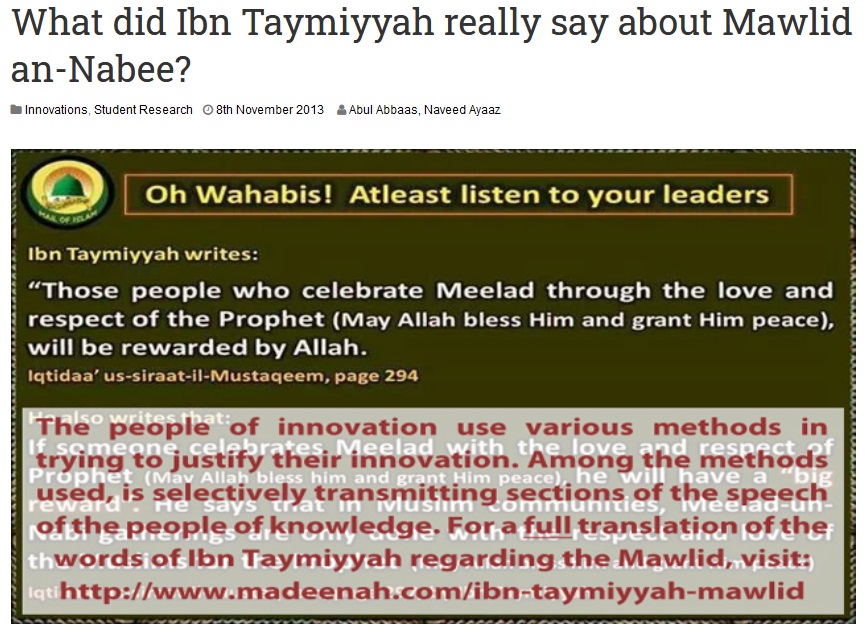 In support of such claims, they misquote Shaykh al-Islam Ibn Taymiyyah (who suddenly becomes relevant to them when it comes to their heresies) in his Iqtidaa’ al-Sirat al-Mustaqeem li Mukhaalafat ashaab al-Jaheem (Following the Straight Path in Differentiating from the Companions of the Hell-Fire) by citing this one bit: