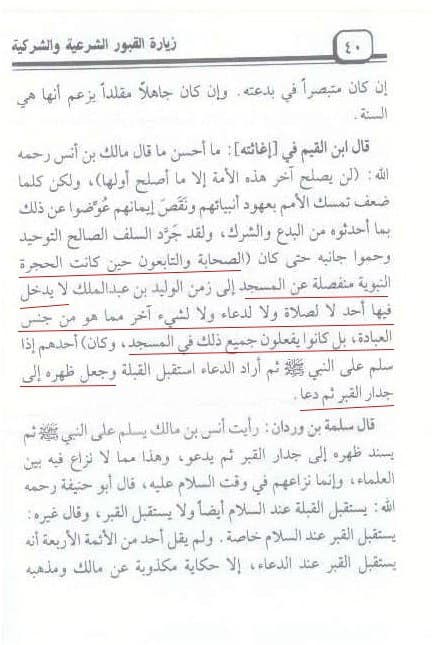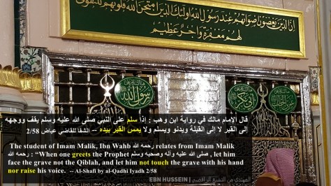 “It is reported from a group of people of knowledge that they prohibited the practice of attaching oneself unto the walls of the grave with one’s stomach and back and also wiping over it (i.e. the grave) with the hands. He mentioned that all of this is from the heretical innovations (bid’ah).” [al-Bahith ‘ala inkar al-Bida’ wa al-Hawadith]