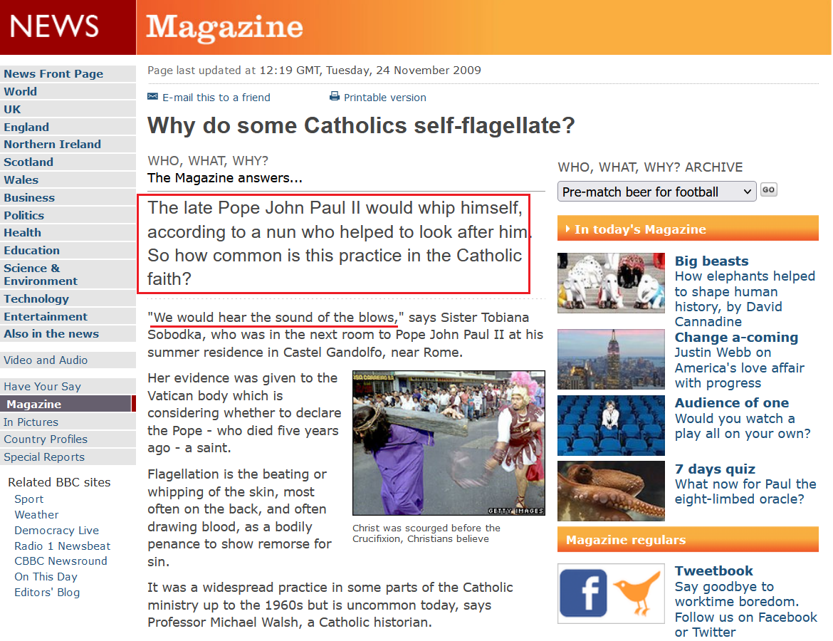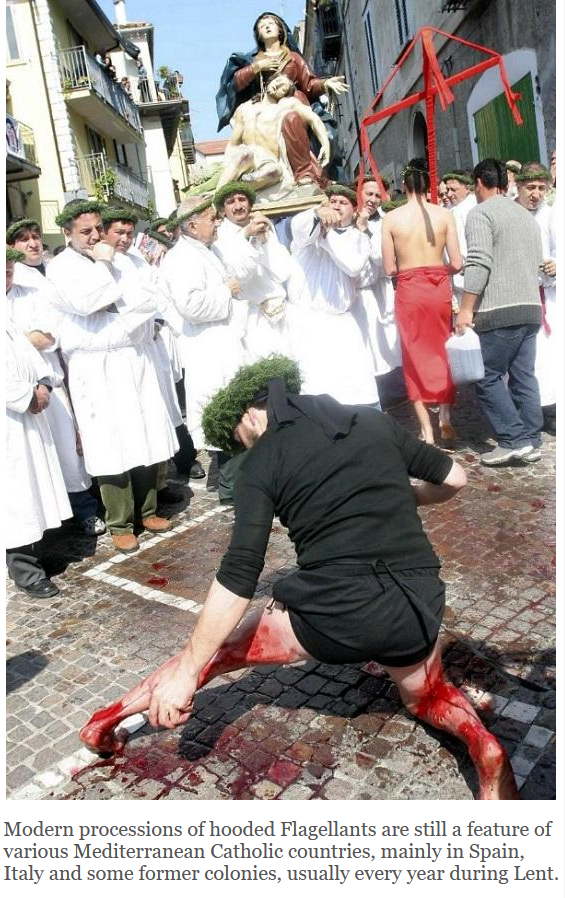 Devout Catholics have practiced mild self-flagellation for centuries, often with a simple belt but sometimes using the cat-tailed whip known as a ‘discipline.’ Although the practice has become rare since the Vatican II reforms in the 1960s, and it’s rarely discussed in public, it is still vividly practiced in many Catholic countries.