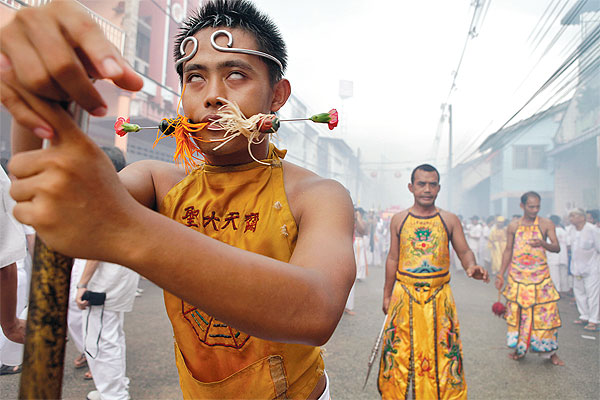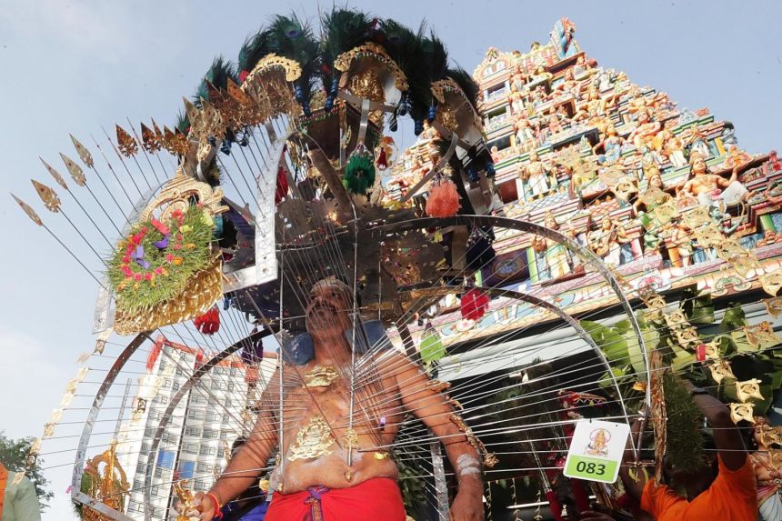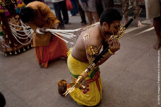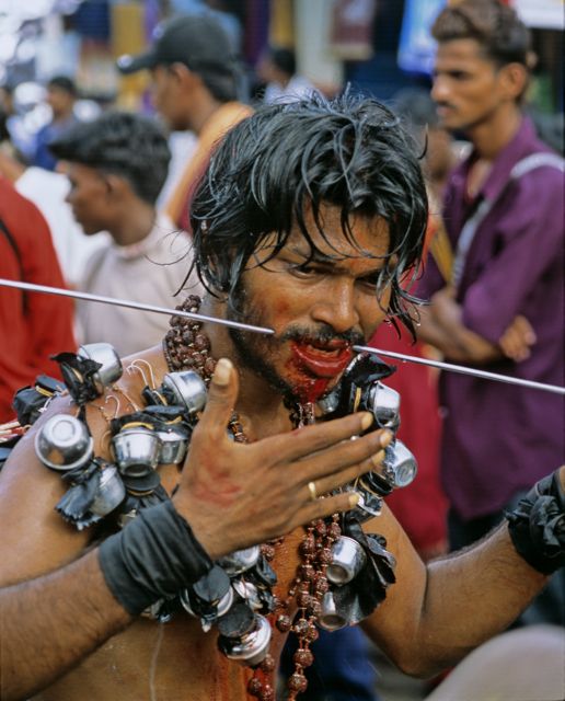 The Thaipusam festival includes a ritual known as Kavadi Attam (‘kavadi dance’) in which people pierce their bodies with skewers and hooks in honour of Murugan (Hindu god of war, brother of Ganesha, and son of Shiva).