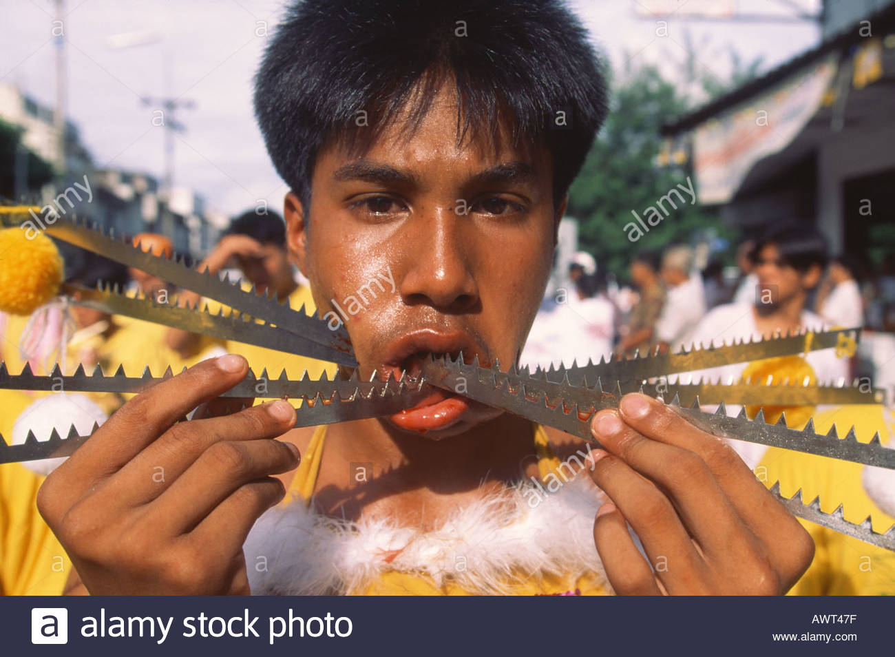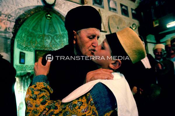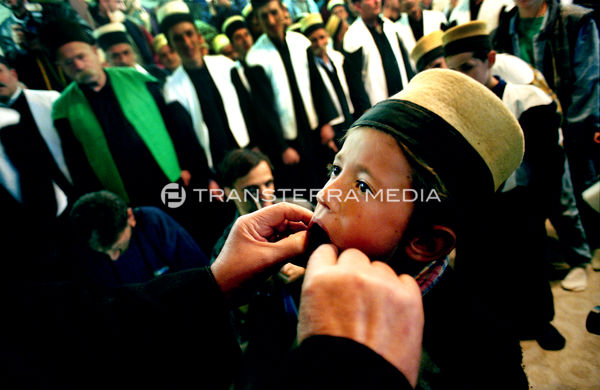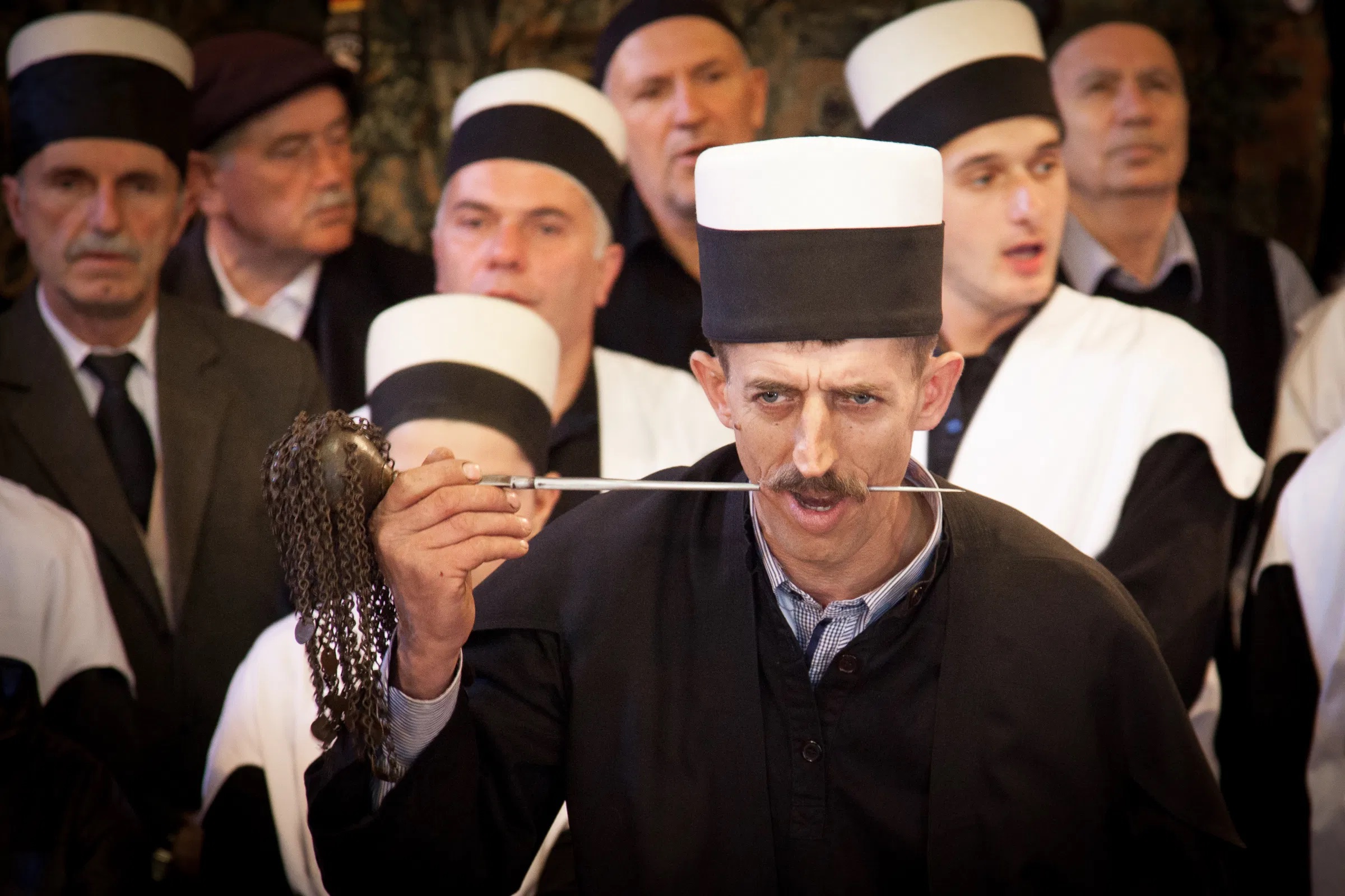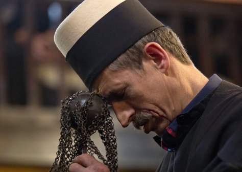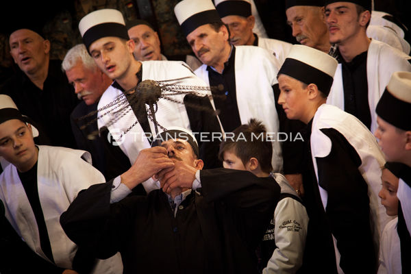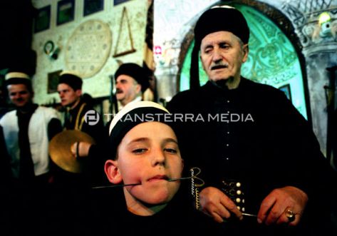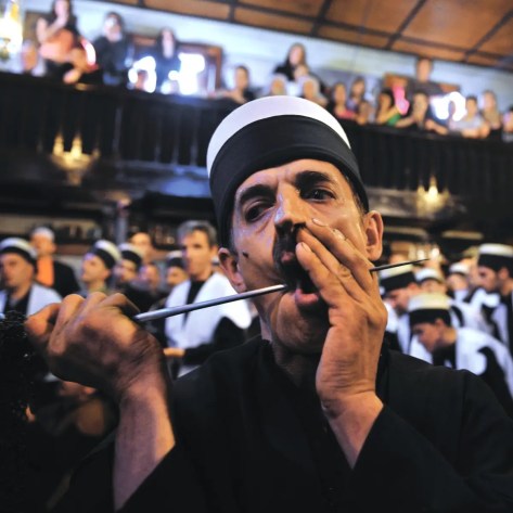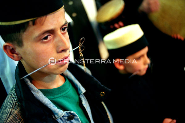 The dervishes pray, dance and sing and try to attain a state of trance. At the culmination of the ritual, the feats of Fakirism take place. Whilst some of the dervishes play and sing, their leader takes long skewers and begins to pierce the mouths of the dervishes who willingly undergo this test, beginning with the children. The older dervishes, the braver and more expert, are pierced with a real sword. A blade is placed on their throat and the shaikh climbs on top of it.