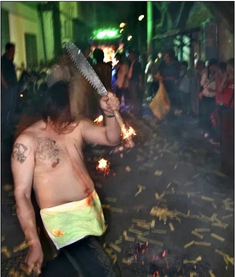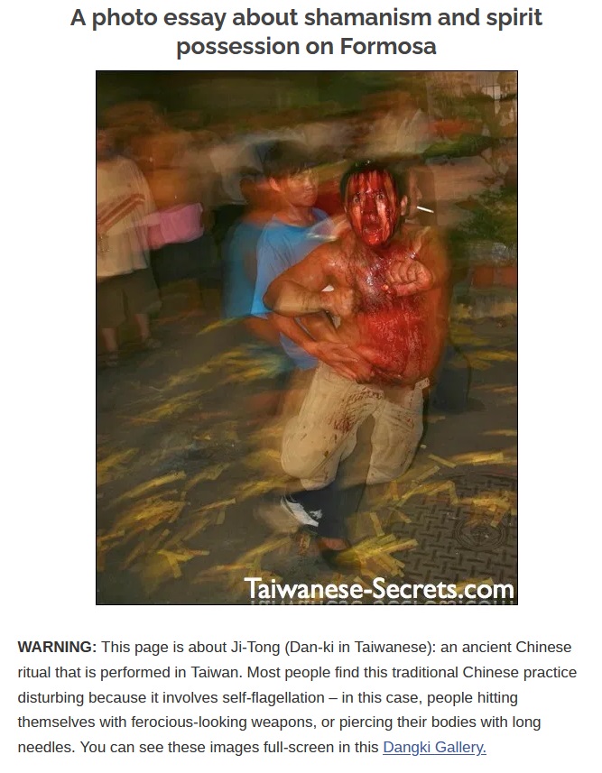 There are many more examples of pagan self-flagellation rituals in various pagan beliefs and cultures. Ji-Tong (Dangki) is yet another disturbing pagan ancient Chinese (Taoist) self-punishment ritual still practiced in Taiwan that could be mistaken for Ashura rituals in Karbala if it wasn’t for the Chinese facial features of its practitioners.