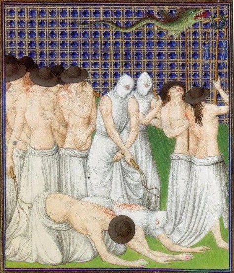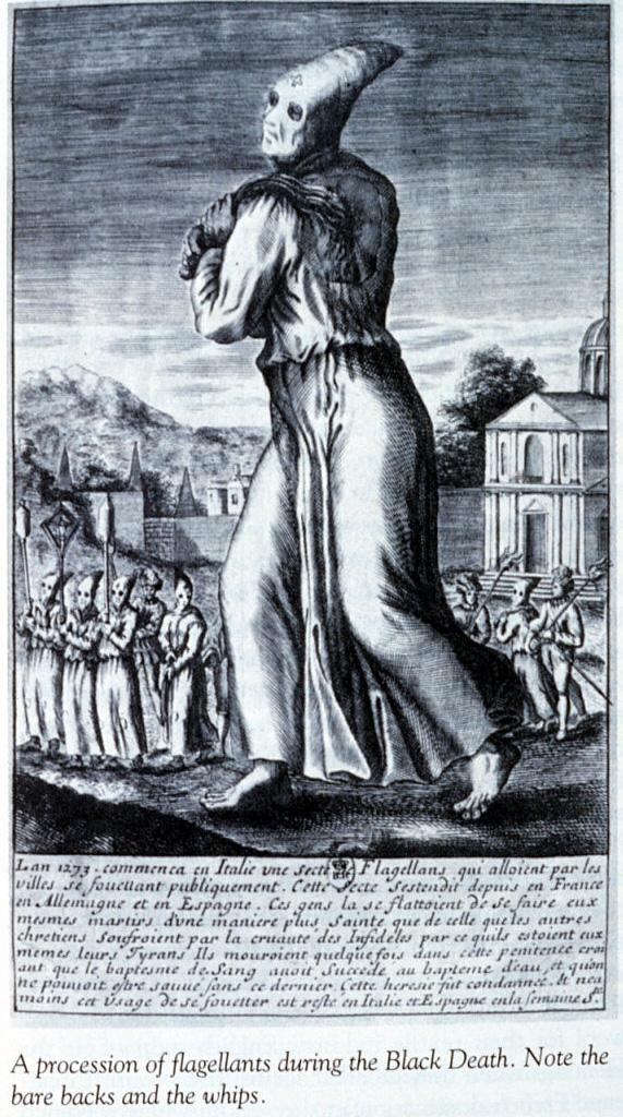 According to medieval chronicler Robert of Avesby, hundreds of flagellants made their way to England in 1349 where he described, they formed a mostly-naked mob as they whipped, chanted, and prostrated themselves in a systematic fashion: