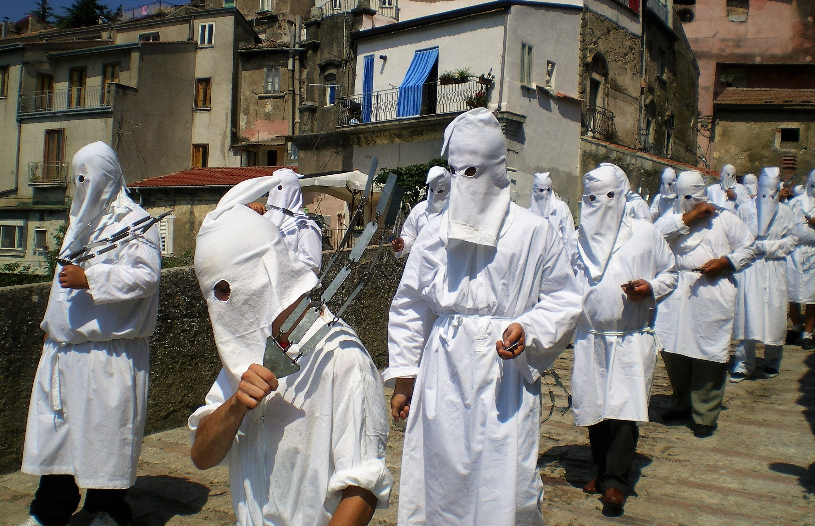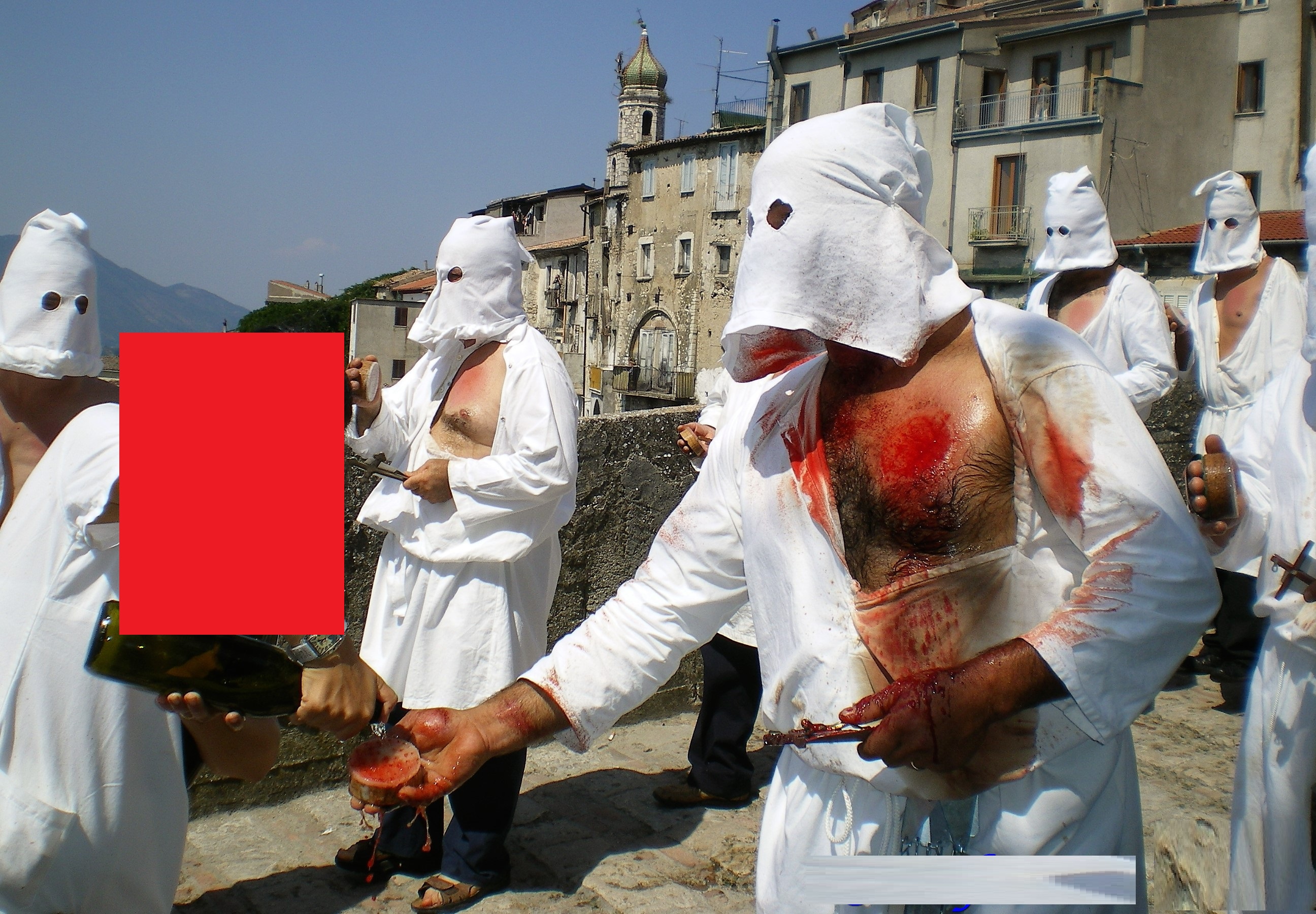 Gruesome and sadomasochistic self-punishments rituals are conducted in the name of Jesus (peace be upon him) on an annual basis in parts of Italy (due to Spain’s influence). One disturbing and macabre procession (not less disturbing than Shia ones) is conducted each year the religious festival, known as the Riti Settennali di Penitenza (Rites of Penance every Seven Years) which commemorates the discovery of a Madonna and Child statue (idol) in a field hundreds of years ago. Similar processions are conducted annually on the occasion of Easter time.