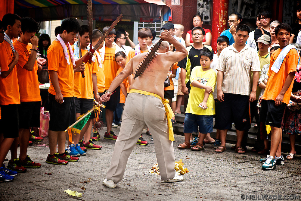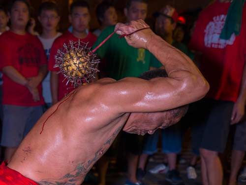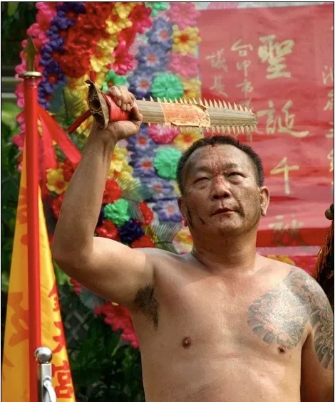Ji Tong 乩童 (aka Tong Ji 童乩 or Tang-ki in Taiwanese), is a rarely seen event of old Taiwanese religious belief. It’s a type of shamanism, where the “spirit-medium” human is possessed by the spirit of a god. After doing so, the god can live for a short while in the body of the medium to prove his existence or even answer questions to the benefit of believers. The more visually interesting aspect of Ji Tong is when the ‘gods’ allegedly take possession at a temple festival. That’s when the spirit-medium often starts self-flagellating himself with spiked bats, swords, and other medieval pain and blood inflicting devices.
