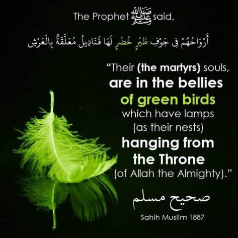 “With regard to the souls of the martyrs, they are in the crops of green birds, and they are like stars in comparison to the souls of the ordinary believers, for they fly by themselves.” [Tafseer Ibn Kathir 2/164]