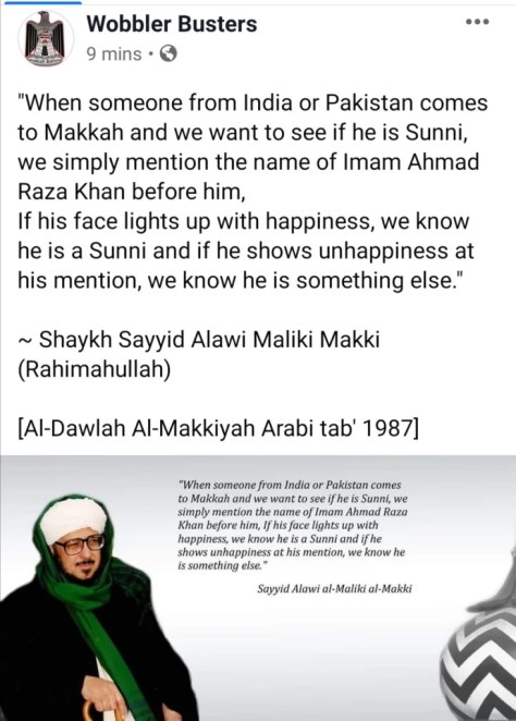 Ibn ‘Alawi obtained ijazahs from infamous heretical batini Sufis, including Mustafa Raza Khan Qadri (1892–1981) who was the leader of the extreme Sufi Barelvi sect following the death of its founder, his father Ahmed Raza Khan who said that ‘Ali b. Abi Talib removes all hardship whenever you call upon him.