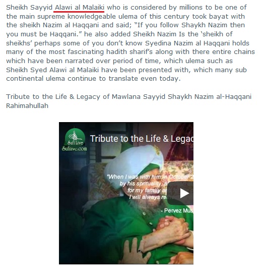 Ibn ‘Alawi obtained ijazahs from infamous heretical batini Sufis, including Mustafa Raza Khan Qadri (1892–1981) who was the leader of the extreme Sufi Barelvi sect following the death of its founder, his father Ahmed Raza Khan who said that ‘Ali b. Abi Talib removes all hardship whenever you call upon him.