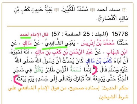 “And a hadith has been narrated to us in the Musnad of Imam Ahmad that contains glad tidings for every believer, confirming that the soul (of the believer) will be roaming freely in Jannah; eating from its fruits; seeing its pleasures and witnessing what generosities Allah has prepared in it. This hadith contains a splendid sahih chain of transmission that includes three of the four imams of the schools of thought: Imam Ahmad (may Allah have mercy upon him) narrated it on the authority of Imam Shafi’i who narrated it on the authority of Imam Malik…” [Tafsir Ibn Kathir, vol. 1, pg. 437]