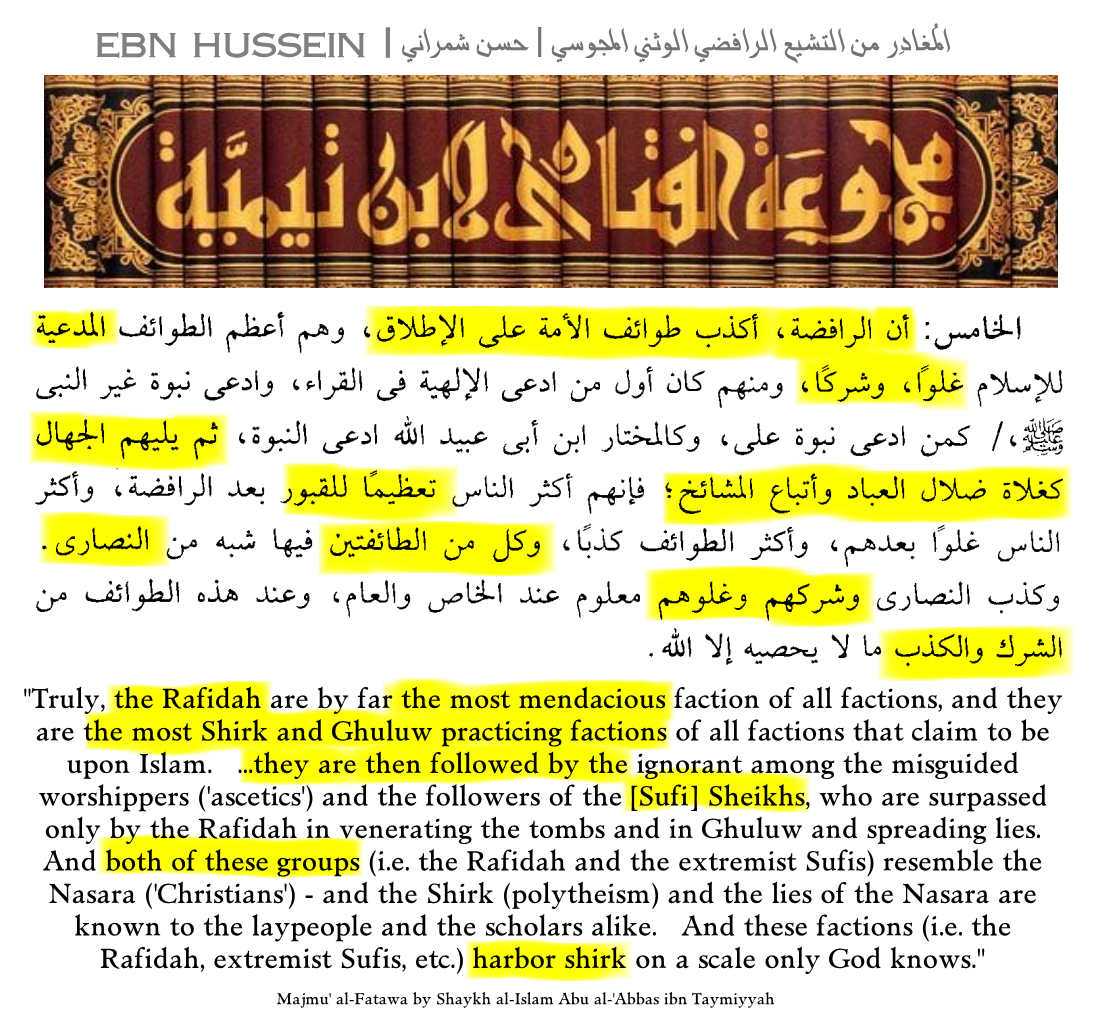 No wonder the grave worshippers hate Shaykh al-Islam Abu al-‘Abbas ibn Taymiyyah, may Allah have mercy upon him. I’d hate him too if he had exposed my religion to the max. What a legend, around 600 years ago he described these batini zanadiqah and mushrikun exactly how they are to this very day (if not worse).
