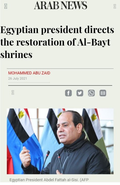 Meanwhile, Abdel Hadi al-Qasabi, the president of the Supreme Council of Sufi Orders, said in a July 26 interview on Mehwar TV, ‘The interest in Ahl al-Bayt shrines is a revival of the values of love, sincerity, tolerance and acceptance of others, which is what we need at this time to preserve the successes of the Egyptian state in all fields during the recent period.”