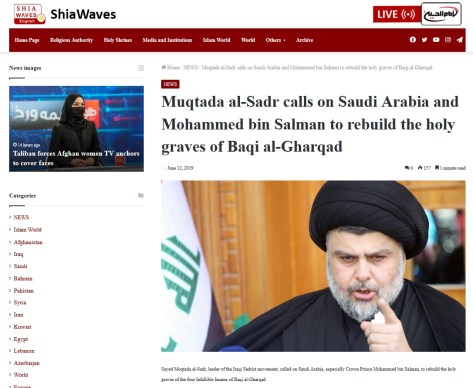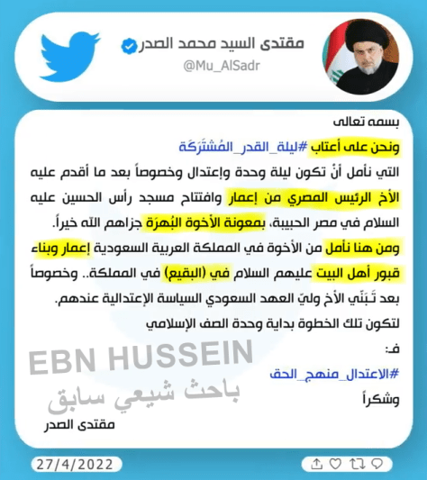 Moqtada al-Sadr took to Twitter to endorse the shrine-renovation initiatives in Egypt. He also shared his aspirations that his counterparts in Saudi Arabia would similarly consider restoring idolatrous Sufi-Rafidi shrines in Al-Baqi cemetery in Madinah. According to Al-Sadr, this action would serve to unite the Muslim community. His tweet concluded with the hashtag #Moderation_Is_Truth.