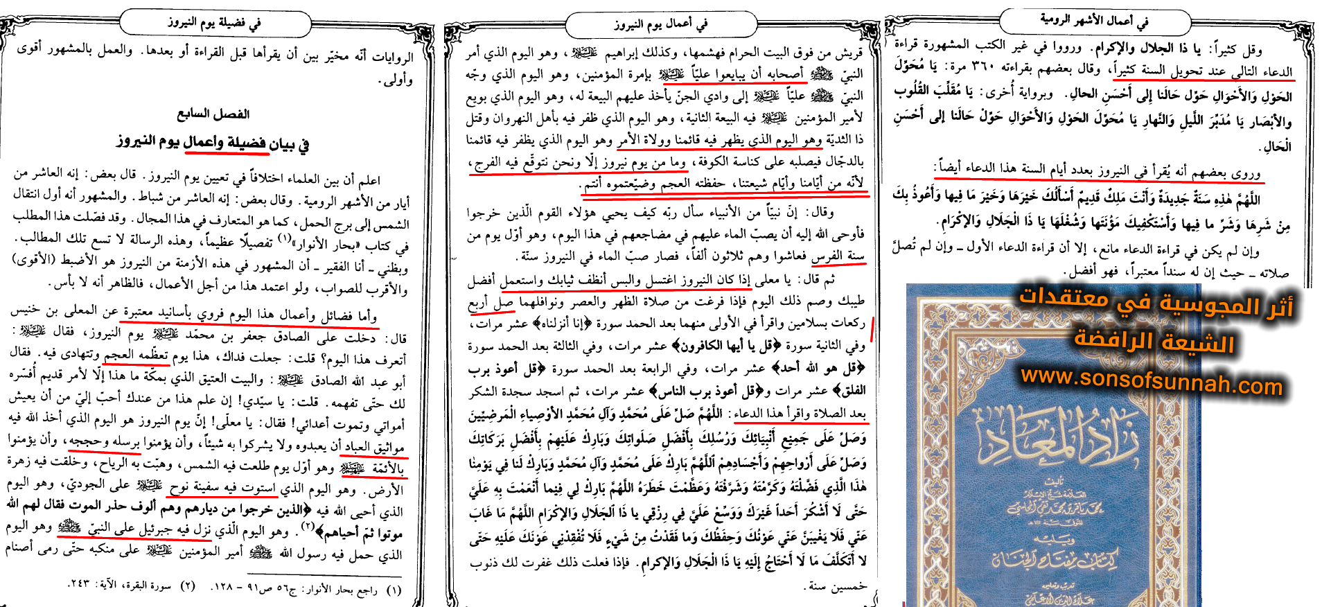 Figures like Majlisi, regarded as pillars of Shiite scholarship on which the entire Shia clergy of today is founded, vigorously advocated for Majoosi/Zoroastrian-rooted holidays such as Nowruz and insisted on its attribution to Islam and the Ahl al-Bayt. However, Islam, the Quran, and the Sunnah have never affirmed such eid, let alone endorsing it as sacred